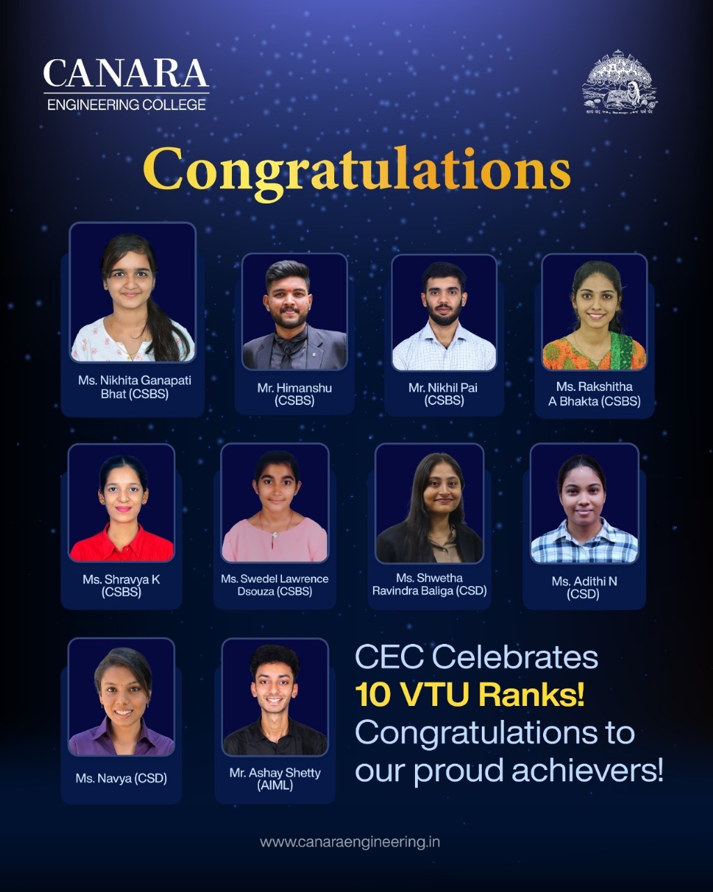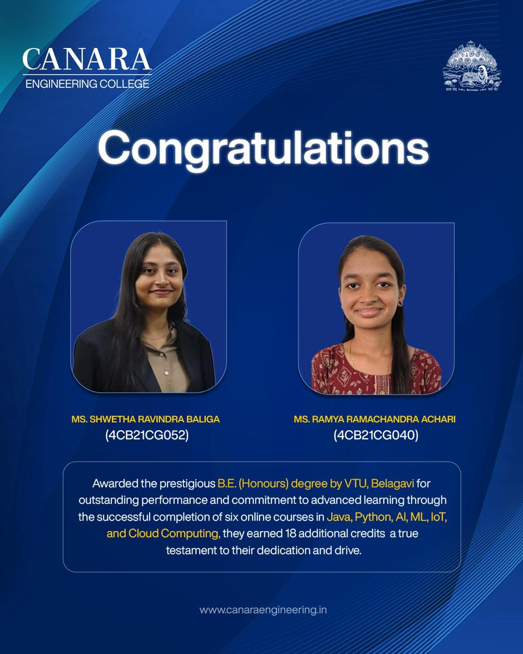 Awarded the prestigious B.E. (Honours) degree by VTU, Belagavi for outstanding performance and commitment to advanced learning through the successful completion of six online courses in Java, Python, Al, ML, IoT, and Cloud Computing, they earned 18 additional credits.