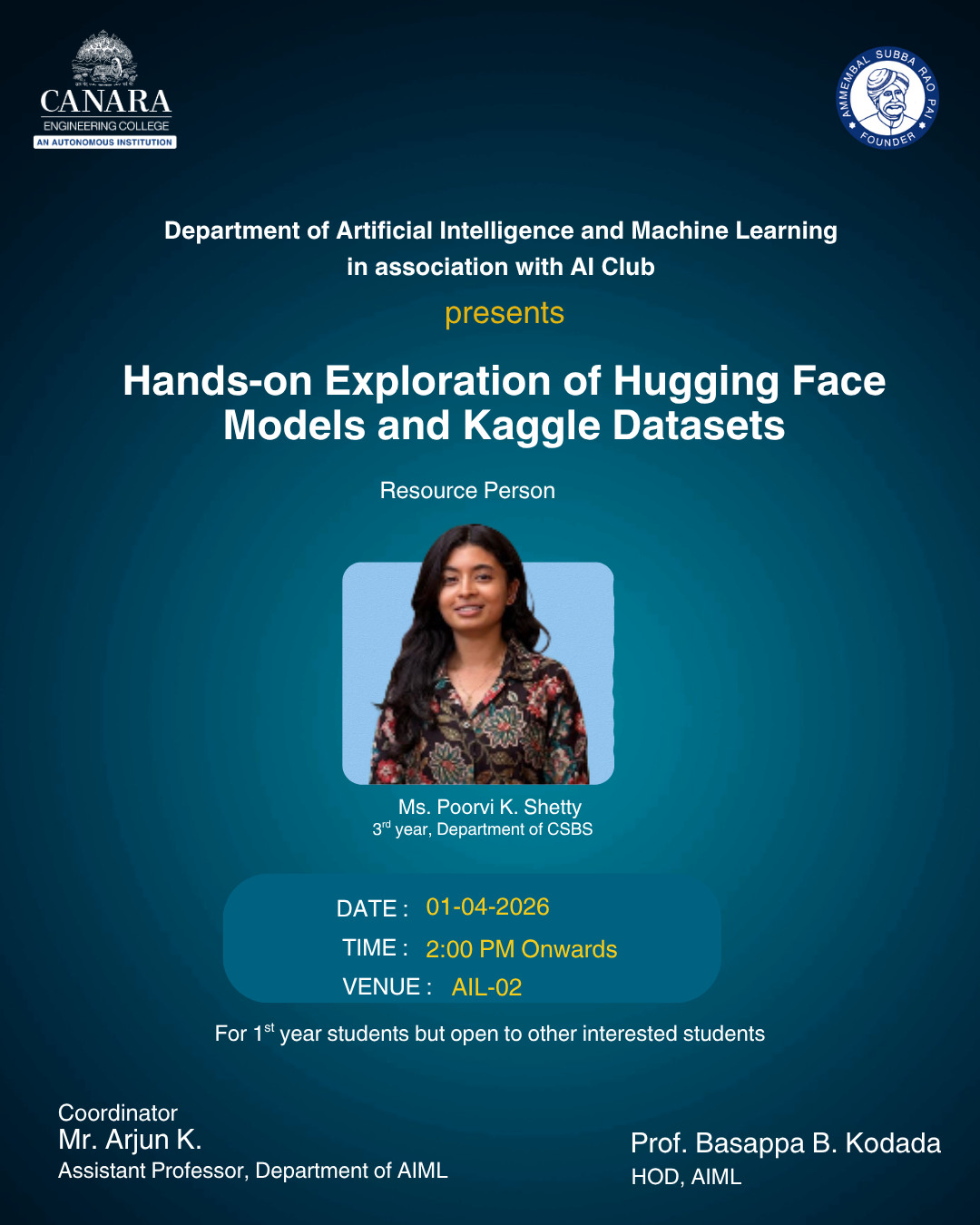 The Department of Artificial Intelligence & Machine Learning, in collaboration with the AI Club, organized an interactive hands-on session on “Hands-on Exploration of Hugging Face Models and Kaggle Datasets.” The session was conducted by Ms. Poorvi K. Shetty, a 3rd-year CSBS student, under the guidance of Mr. Arjun K. The session introduced students to the Hugging Face platform, focusing on how to: Access pre-trained models Use them for machine learning and NLP tasks Run basic implementations Participants were also guided on: Exploring datasets from Kaggle Understanding dataset formats Preparing data for model training and evaluation The session emphasized practical learning, where students actively experimented with tools and observed real-time outputs. This approach helped bridge the gap between theoretical knowledge and real-world application. |