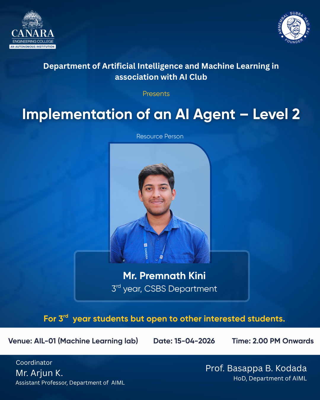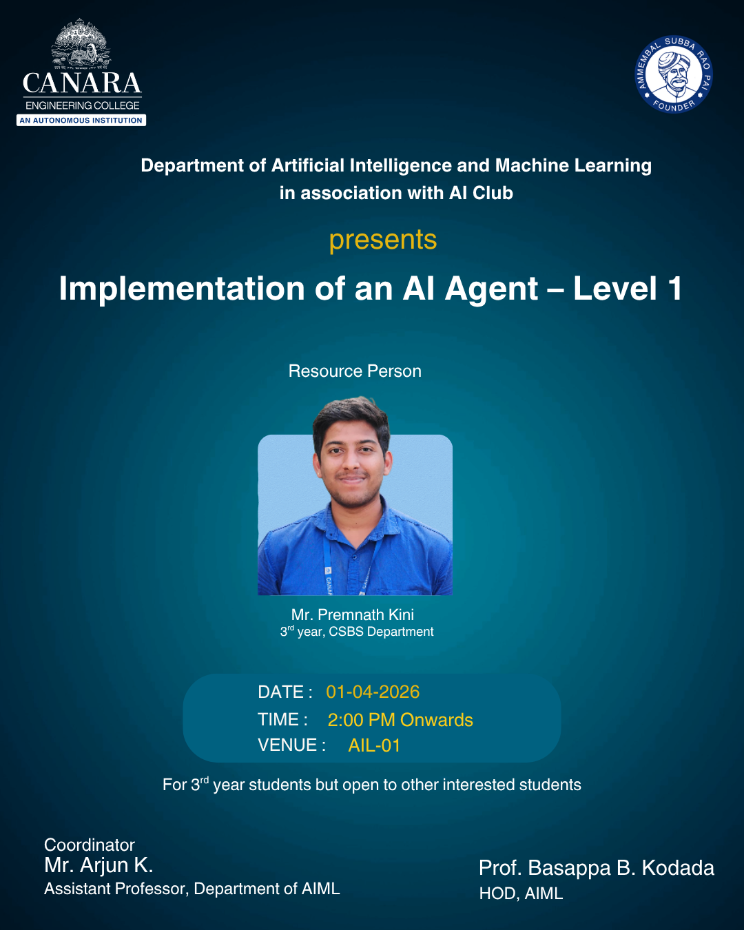 The Department of Artificial Intelligence & Machine Learning, in association with the AI Club, organized a hands-on session titled **“Implementation of an AI Agent – Level 2.”** The objective of the session was to provide practical knowledge on designing and implementing basic intelligent agents. The session was conducted by Mr. Premnath Kini, 3rd-year CSBS student, who introduced participants to the fundamentals of AI agents. Students learned how agents perceive inputs, process information, and take actions based on predefined logic. The session focused on step-by-step implementation using simple programming techniques. Key concepts such as environment, decision-making, and rule-based behavior were demonstrated. A total of 16 students actively participated in the event. The program was coordinated by Mr. Arjun K., Assistant Professor, Department of AIML. |