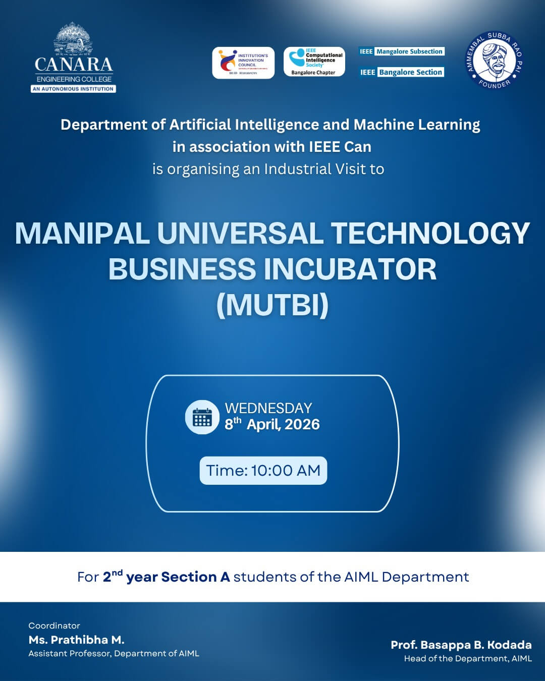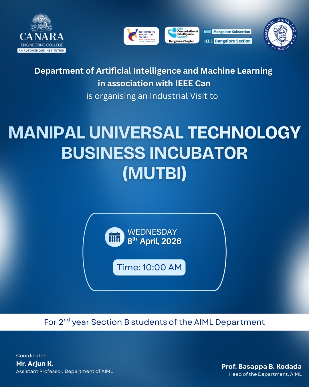 The Department of Artificial Intelligence & Machine Learning, in association with IEEE Can, organized an industrial visit to MUTBI, Manipal on 8th April 2026 for 2nd-year students. The session began with an insightful talk by Dr. Santhosha Rao, CEO of MUTBI, who highlighted the importance of an entrepreneurial mindset and real-world problem solving. He emphasized validating ideas before developing products. The visit was coordinated by Mr. Arjun K. Students were introduced to the startup ecosystem and incubation process. A guided tour of the facility provided exposure to startups working in domains such as Agri-tech, Healthcare, and Logistics. The visit helped bridge the gap between academic learning and industry practices, inspiring students towards innovation and entrepreneurship. |