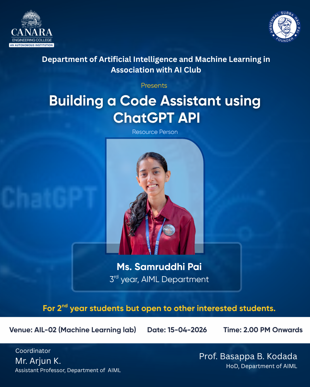 The Department of Artificial Intelligence & Machine Learning, in association with the AI Club, organized a hands-on session on “Building a Code Assistant using ChatGPT API” for students. The session was conducted by Ms. Samruddhi Pai, 3rd-year AIML student, who introduced participants to the fundamentals of the ChatGPT API and its practical applications in software development. Students learned how to design a basic code assistant capable of generating, debugging, and explaining code. The session also covered API integration, handling user input, and structuring responses effectively. Real-time examples were demonstrated to enhance understanding of AI-powered development tools. The session was interactive and encouraged students to explore innovative AI-based projects. A total of 12 students actively participated in the event. The program was coordinated by Mr. Arjun K., Assistant Professor, Department of AIML. |