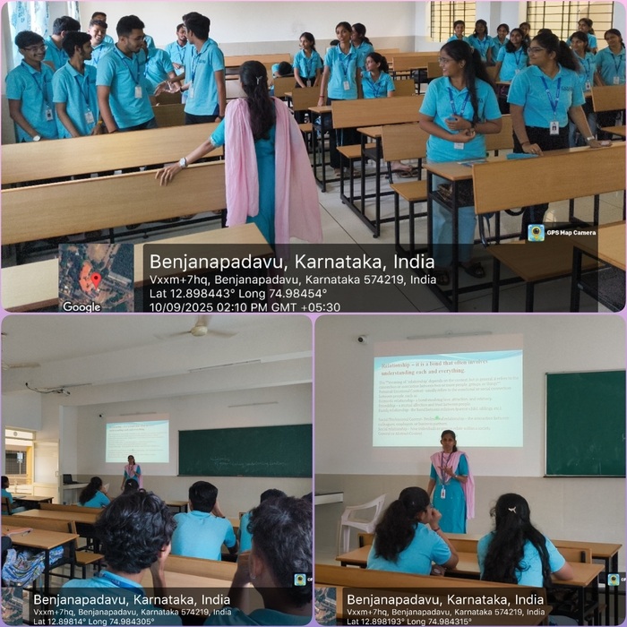 A talk on "The psychology of human interaction" was organized by the Department of Computer Science and Design on 10/09/25 in association with the Department of Student Welfare, CEC Benjanapadav. The session emphasized the importance of effective communication, empathy, and mutual respect in fostering strong interpersonal relationships. The speaker introduced the techniques for active listening, setting healthy boundaries, and handling conflicts constructively. The speaker supported in ventilating their feelings and emotions. Through interactive discussions and practical examples, the session encouraged participants to reflect on their own relationship styles and identify areas for growth. |