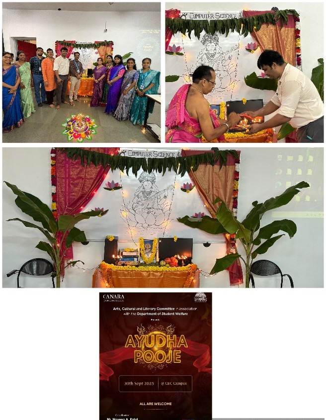 The Department of Computer Science and Design organized the Ayudha Pooja celebration to express gratitude towards the tools, systems, and technologies that support learning and innovation. The event began with traditional rituals performed by the priest, followed by devotional bhajans sung by the students, creating a serene and spiritual atmosphere. Faculty members, staff, and students actively participated in the celebration, highlighting unity and cultural harmony within the department. The event beautifully blended tradition with modern academic spirit, reminding everyone of the importance of respect, dedication, and teamwork in achieving excellence. |