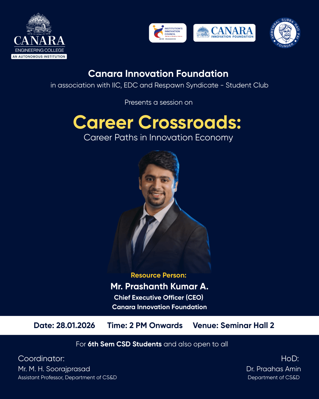 Canara Innovation Foundation, in association with the Institutions Innovation Council (IIC), Entrepreneurship Development Cell (EDC), and Respawn Syndicate Student Club, organized this insightful session on "Career Crossroads: Career Paths in Innovation Economy" at Canara Engineering College. Held on January 28, 2026, at 2:00 PM in Seminar Hall 2, the event targeted 6th semester CSD students and was open to all interested participants. The session provided students with practical perspectives on emerging career opportunities, the relevance of innovation in modern workplaces, and strategies to position themselves competitively in the innovation-driven economy. Through real-world examples and industry insights, Mr. Prashanth Kumar A. guided students through various career trajectories available to engineering graduates in today's innovation ecosystem. |