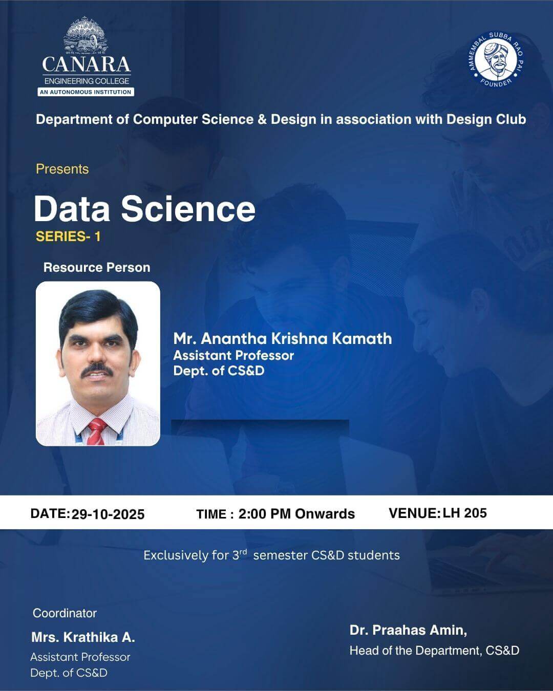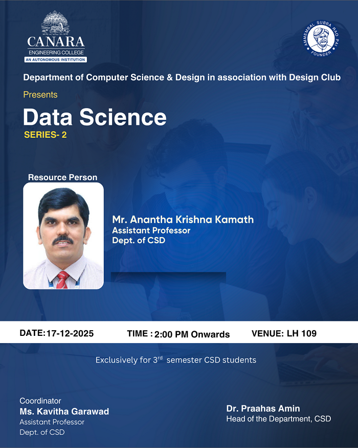 The Department of Computer Science and Design organized the “Data Science – Series 1” session on Wednesday, 29th October 2025, from 2:00 PM onwards for the III Semester CSD students. The session was held under the guidance of Dr. Praahas Amin, Head of the Department, and coordinated by Mrs. Krathika A., Assistant Professor, CSD Department. The resource person, Mr. Anantha Krishna Kamath, Assistant Professor, CSD Department, delivered an insightful talk on the fundamentals of Data Science, covering concepts such as data collection, preprocessing, analysis, and visualization. A total of 20 students participated actively and gained valuable knowledge about the scope and applications of data science in modern technology. The session provided a strong foundation and marked a successful beginning to the Data Science Series. |