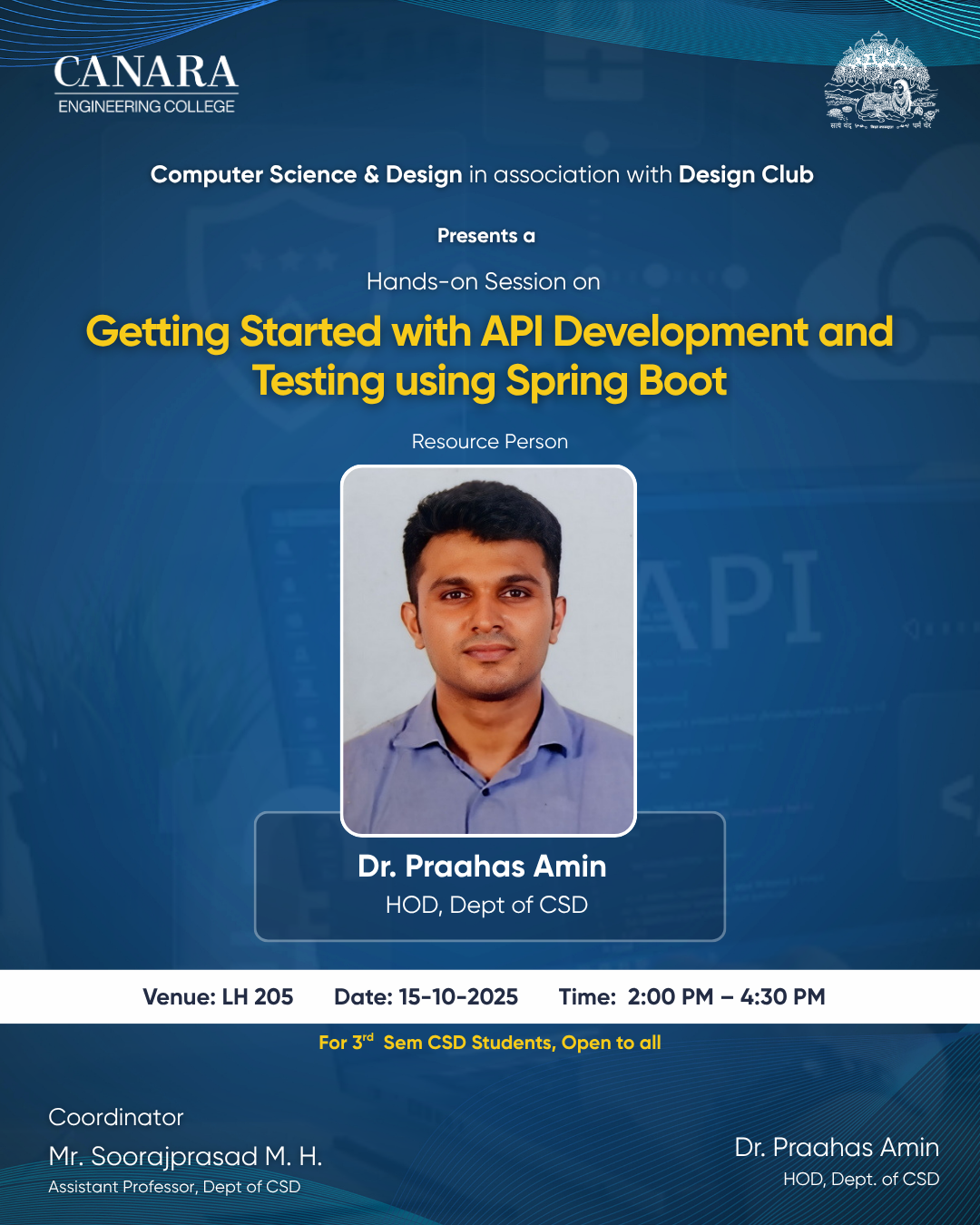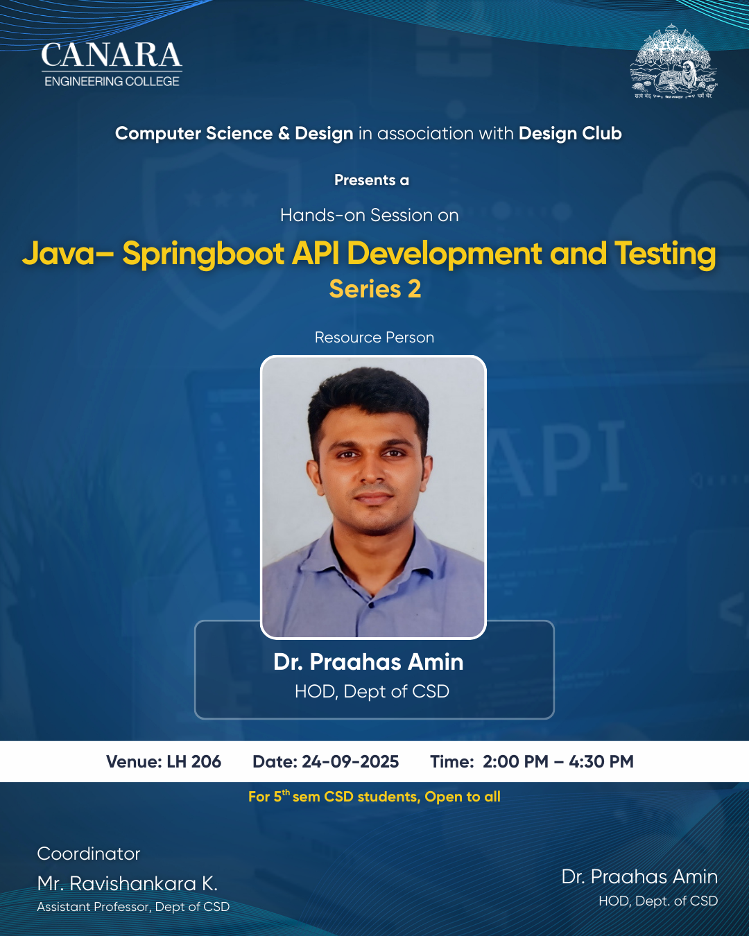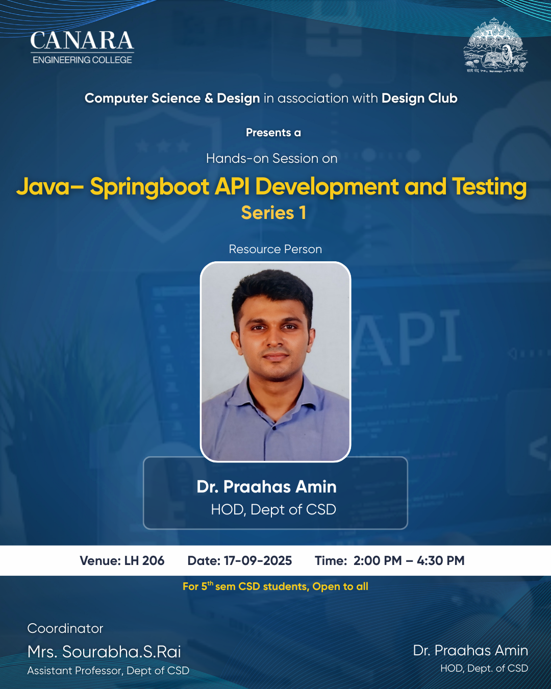 A total of 64 students participated (10 from 3rd sem CSD, 50 from 5th sem CSD, and 4 from IS). The session was interactive, informative, and provided practical insights into API development and testing using Spring Boot. |
