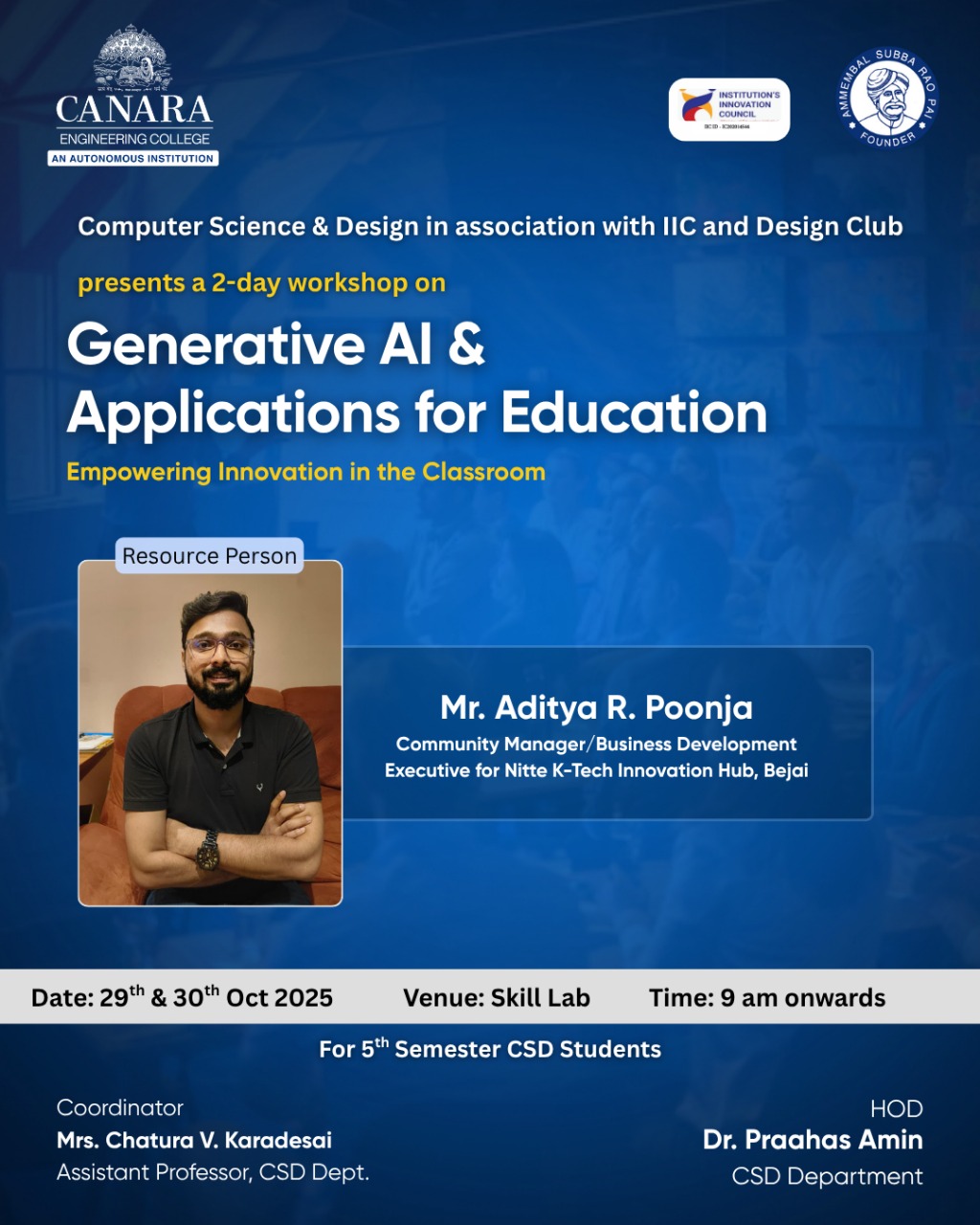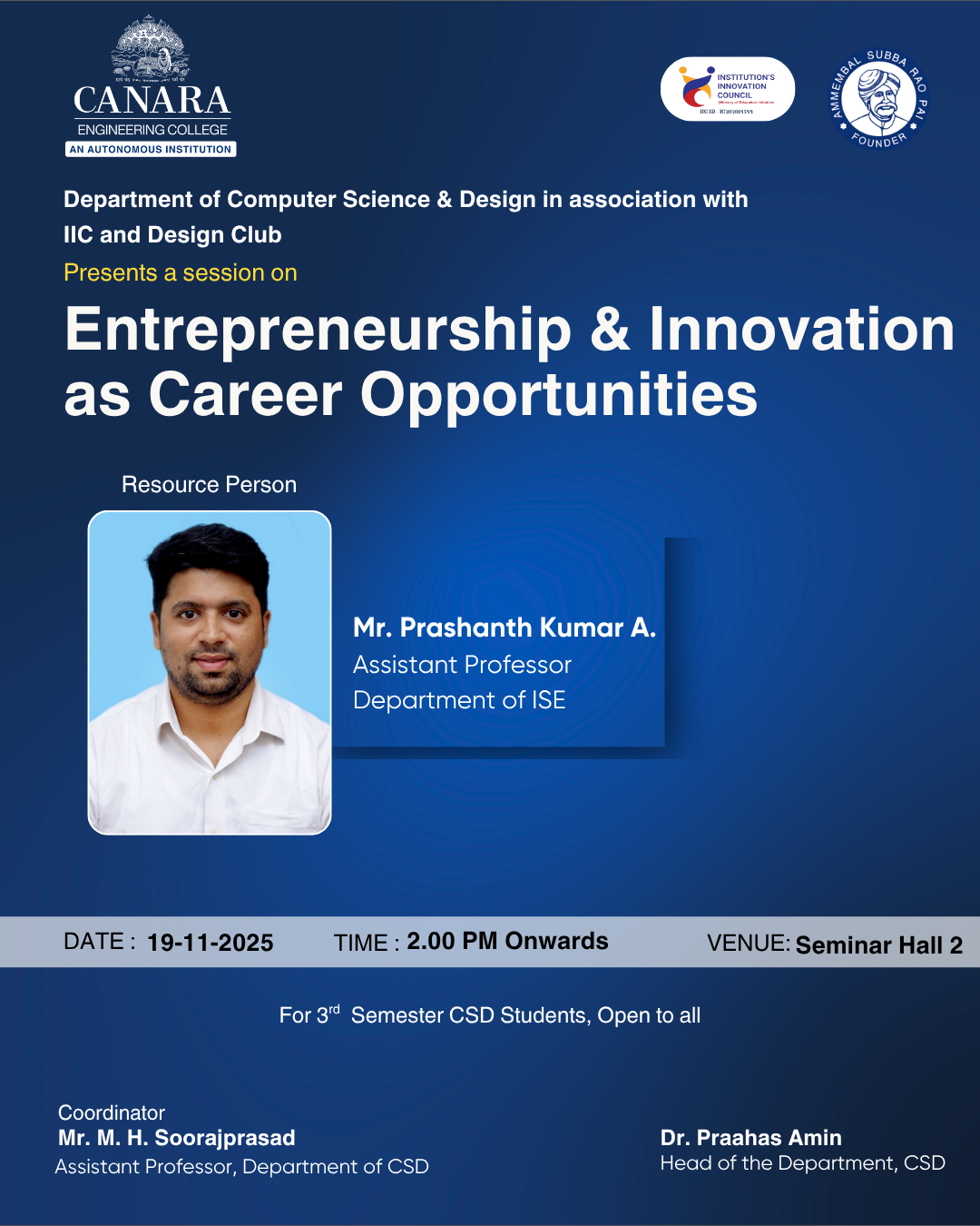 The Department of Computer Science & Design, in association with the IIC and Design Club, organized a session on Entrepreneurship & Innovation as Career Opportunities. The session was conducted for 3rd-semester CSD students and was open to all interested participants. The resource person, Mr. Prashanth Kumar A., shared valuable insights into the role of innovation in shaping modern careers and the growing significance of entrepreneurship in the global market. He discussed how students can identify opportunities, develop innovative ideas, and translate them into sustainable ventures. The event also highlighted the skills and mindset required to succeed as an entrepreneur. Students actively engaged in the discussion, gaining clarity on how innovation can guide their academic and professional journeys. |