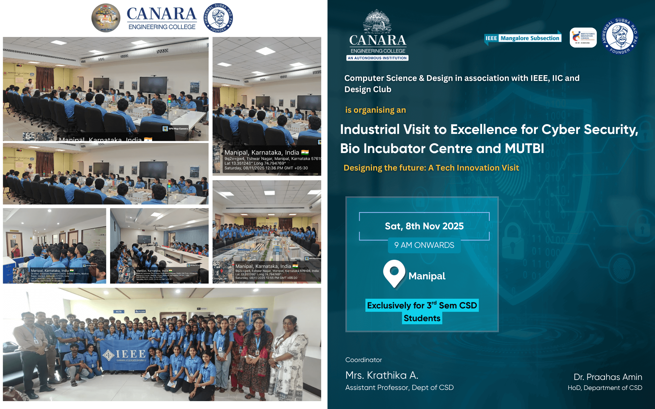 Department of CSD in assoication with IEEE student branch and IIC had industrial visit to Manipal incubation centre for 4th sem, “Exploring options for Entrepreneurship-discussion with startup eco system enablers and 6th sem for SOIS lab,Innovation Centre and Cybersecurity cantre at MAHE. Students gained insights into how incubator centres operate, including the resources they provide, such as mentorship, funding opportunities, office space, start up and networking .Students had a enriching experience, offering valuable insights into the forefront of technological and scientific development. link:https://www.linkedin.com/posts/canara-engineering-college-official_the-department-of-computer-science-and-design-activity-7211585021315284992-6flo,Instagram link:https://www.instagram.com/p/C8ta9i8IH07/?igsh=MW5rNHczaHlnYmxlbg== |
