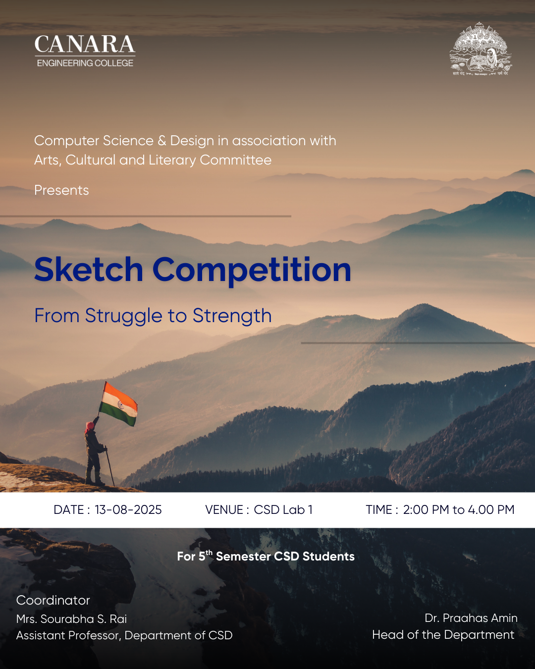 As part of the Independence Day celebrations and Wednesday activity, a Sketch Competition was organized on 13th August 2025 in CSD Lab 1 from 2:00 PM to 4:00 PM. The theme of the competition was “From Struggle to Strength.” The event was presided over by Mr. Paahas Amin, HOD, and coordinated by Ms. Sourabha S. Rai. A total of three students participated, showcasing creative and thought-provoking sketches that reflected India’s journey from the freedom struggle to becoming a strong and self-reliant nation. The competition provided a platform for students to express their patriotism through art and encouraged them to connect with the spirit of Independence Day. |