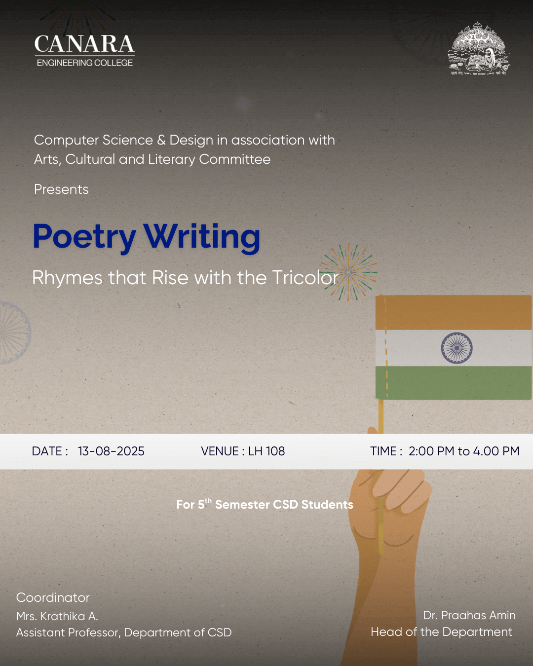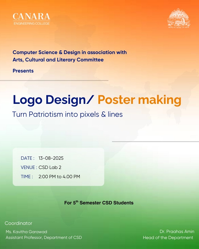 To celebrate the spirit of freedom and creativity, a poetry writing event titled "Rhymes That Rise with the Tricolor" was organized for the students of 5th Semester CSD as part of the Wednesday Activity marking Independence Day on 13th August 2025. The event encouraged students to express their patriotic fervor through powerful verses, weaving words that reflected the pride, sacrifice, and dreams of our nation. Each poem stood as a tribute to the tricolor, rising with emotion, rhythm, and heartfelt expression. The event was coordinated by Mrs. Krathika A, who guided the participants with enthusiasm and support. The department extends sincere gratitude to Dr. Praahas Amin, HOD – CSD, for his continuous encouragement and leadership in fostering student creativity and national spirit. With 5 talented participants, the session was not just a celebration of independence, but a testament to the power of words in honoring our nation's legacy |