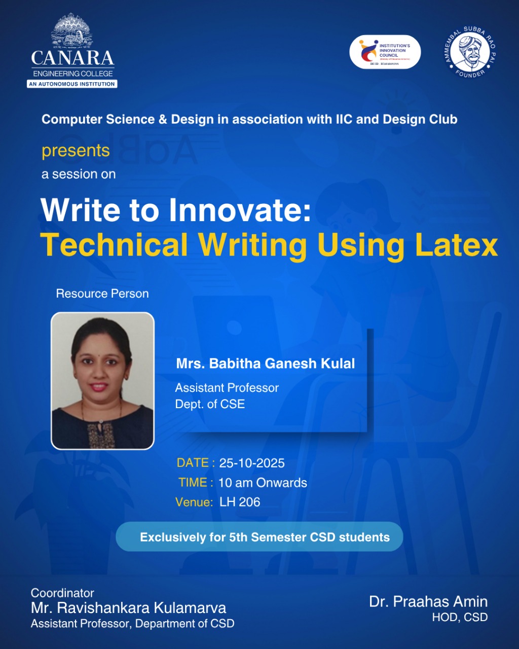 The workshop “Write to Innovate: Technical Writing using LaTeX” equipped participants with essential skills for creating professional-quality technical and research documents using the LaTeX typesetting system. The session introduced participants to the structure and workflow of LaTeX, emphasizing clarity, precision, and consistency in formatting technical reports, research papers, and project documentation. Through hands-on demonstrations, attendees learnt to include mathematical equations, tables, figures, algorithms, and citations effectively. The workshop also highlighted best practices for document organization, template customization, and collaboration using tools like Overleaf. By the end of the program, participants were able to confidently prepare publication-ready manuscripts and enhance the overall quality of their technical communication. |