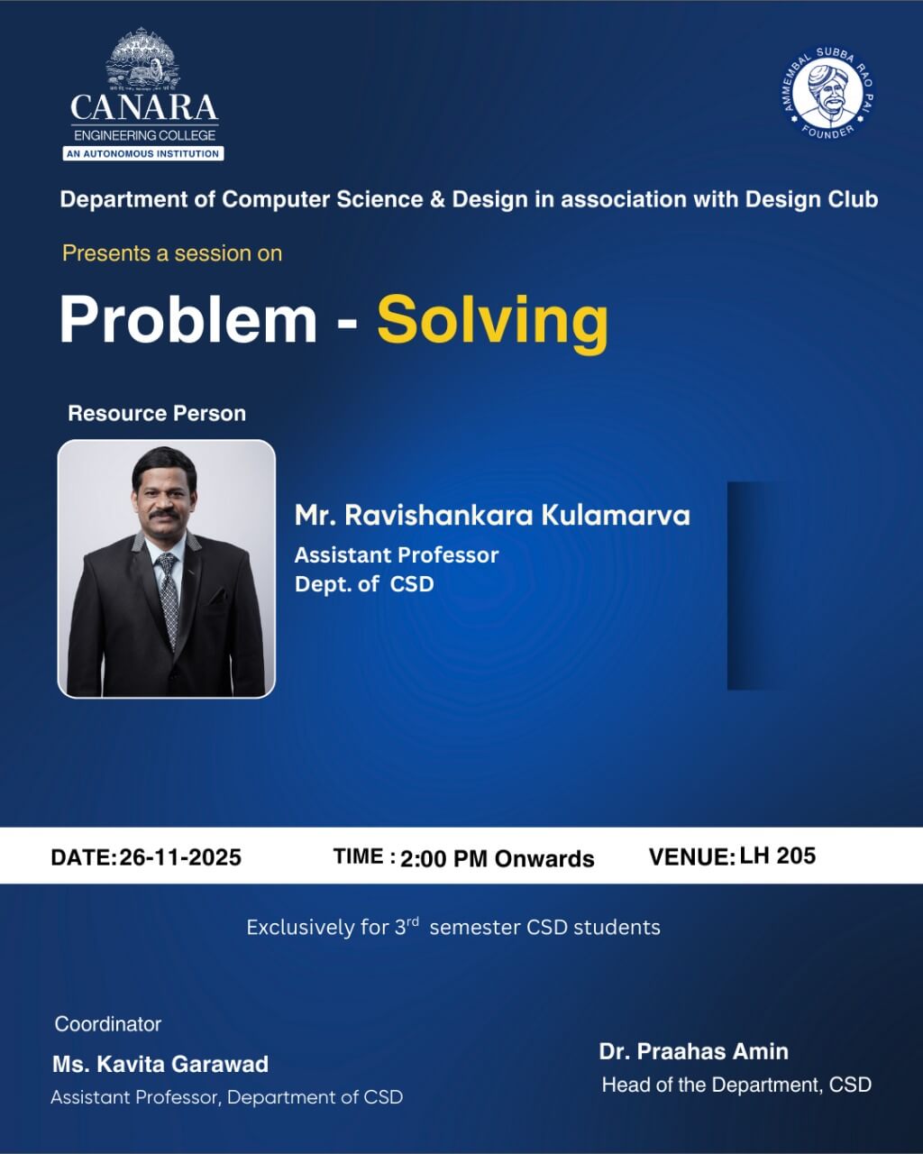 The Department of Computer Science & Design, in association with IIC and Geekhub/Industry Connect, organized a Hands-on session on "Programming and Problem-Solving Session - 1" exclusively for 6th semester CS&D students on April 2nd, 2025, at LH 206. The session was conducted by Mrs. Sourabha S Rai, Assistant Professor, Dept. of CS&D, who guided students through various problem-solving techniques and programming concepts. The event was coordinated by Mrs. Sourabha S Rai, under the guidance of Dr. Praahas Amin, HOD, Dept. of CS&D. |