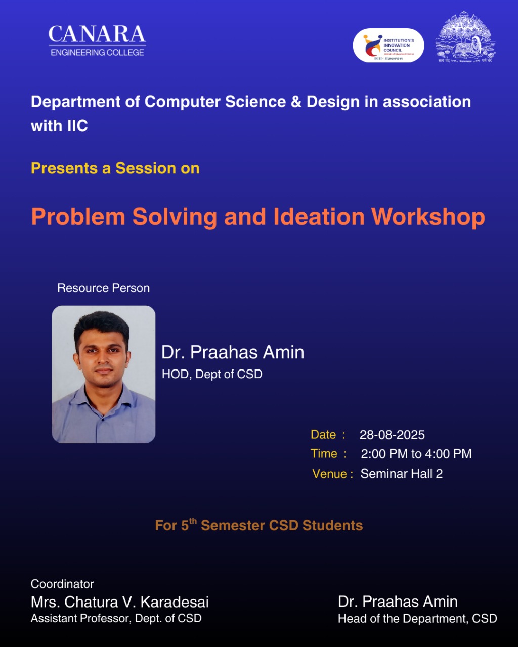 The Department of Computer Science & Design, in association with IIC and Geekhub/Industry Connect, organized a Hands-on session on "Programming and Problem-Solving Session - 2" exclusively for 6th semester CS&D students on April 16, 2025, at LH 206. The session focused on algorithm-based problem-solving techniques, helping students enhance their logical thinking and coding skills through real-time practice and interactive discussions. The session was conducted by Mr. Ravishankar Kulamarva, who effectively guided the students through various algorithmic approaches and best practices in problem-solving. The event was coordinated by Mrs. Sourabha S Rai, under the guidance of Dr. Praahas Amin, HOD, Dept. of CS&D. |