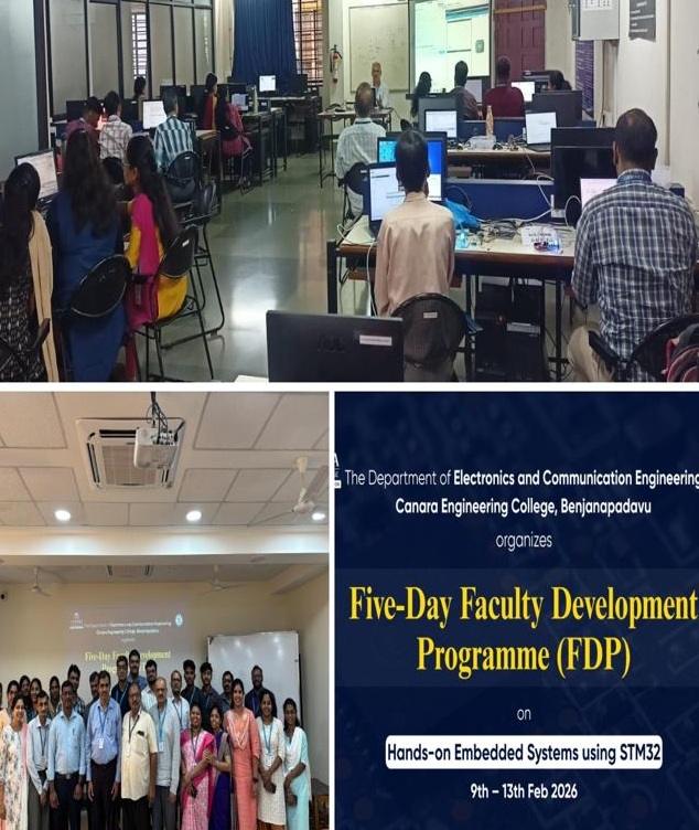 The Department of Electronics and Communication Engineering organized a Five-Day Faculty Development Programme (FDP) on “Hands-on Embedded Systems using STM32” at Canara Engineering College from 9th to 13th February 2026. The programme witnessed active participation from 34 faculty members of Canara Engineering College as well as faculty from other institutions, representing Electronics, Electrical, Computer Science, and related disciplines. The five-day FDP emphasized a strong practical orientation, with extensive hands-on sessions enabling participants to gain real-time experience in working with STM32 microcontrollers. The sessions covered key topics such as STM32 architecture, ARM Cortex-M fundamentals, GPIO programming, timer configuration, UART communication, sensor interfacing, and debugging techniques using STM32CubeIDE. The FDP also introduced participants to the concept of Artificial Intelligence at the edge through TinyML, highlighting the growing importance of integrating intelligence into embedded systems. The programme was coordinated by Ms. Savitha Acharya, Assistant Professor, Department of Electronics and Communication Engineering, under the guidance of Dr. Raghavendra M Shetty K, Head of the Department of Electronics and Communication Engineering, and with the support of the faculty members of the department. Objectives of the FDP: • To understand the architecture and programming of STM32 microcontrollers and to develop practical skills in configuring and interfacing embedded peripherals such as GPIO, timers, and communication interfaces. • To provide hands-on experience in developing and debugging embedded system applications using STM32CubeIDE. • To introduce participants to emerging trends such as TinyML and AI on embedded platforms. |