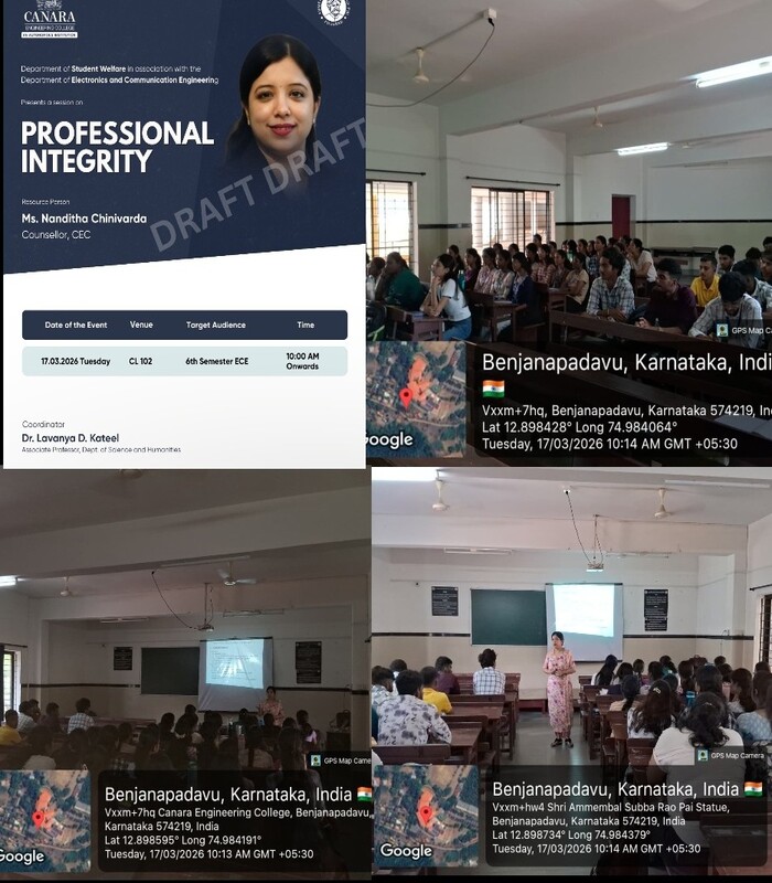 A session on “Professional Integrity” was organised by the Department of Student Welfare on 17th March 2026, in association with the Department of Electronics and Communication Engineering CEC, Benjanpadav, exclusively for the 3rd-year ECE students at CL102. The session was coordinated by Dr Lavanya. D. Kateel. The session was conducted to help students realise the importance of ethical conduct, sincerity, accountability, and consistency in their actions, emphasising their relevance in both academic pursuits and professional practice. The session included real-life case studies highlighting ethical dilemmas, professional conduct, workplace ethics, honesty, accountability, and social responsibility. Students actively participated in discussions and shared their viewpoints on various ethical situations. The interactive approach helped students understand the importance of integrity in building trust, credibility, and long-term professional success. The session effectively sensitized students to ethical responsibilities and encouraged them to practice ethical values in academic and professional life |