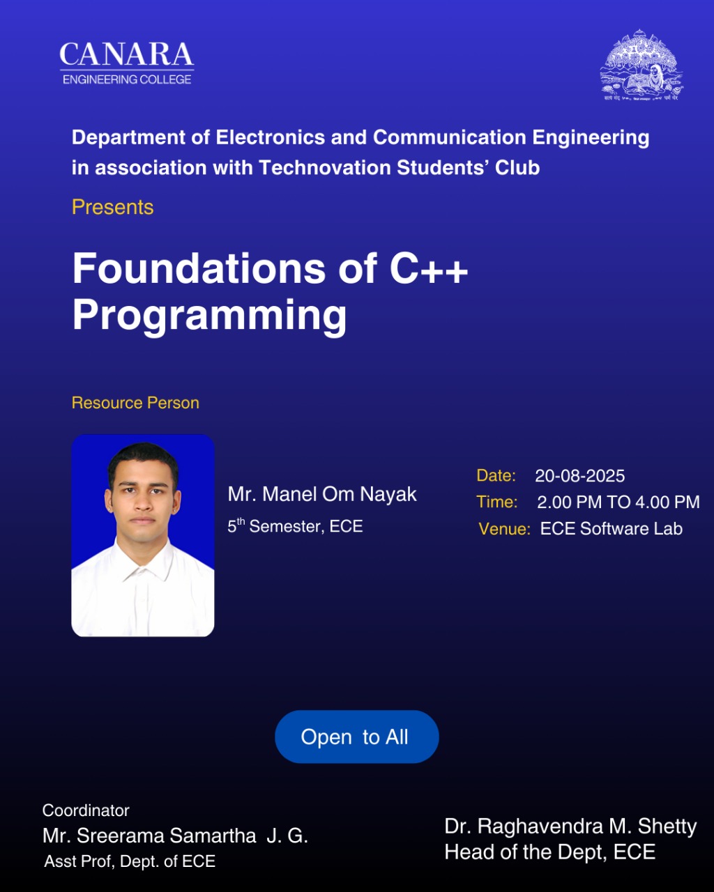The Department of Electronics and Communication Engineering, in association with the Embedded/IoT Student Club, organized a hands-on workshop on “C++ Programming Operators” on 22nd September 2025 at the ECE Software Lab. The session was conducted from 2:00 PM to 4:00 PM, under the coordination of Mr. Sreerama Samartha J G, Assistant Professor, ECE. The workshop provided an engaging platform for participants to learn about different types of operators in C++, their applications, and implementation techniques. Interactive demonstrations and coding examples helped students gain practical exposure and deepen their conceptual clarity. |