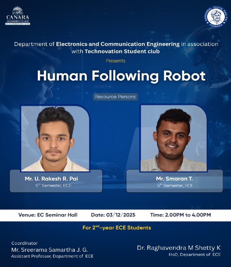 The *Human Following Robot* event focuses on demonstrating an autonomous robotic system capable of detecting and following a human in real time. The event highlights the use of sensors, computer vision, and artificial intelligence in robotics. Participants gain insight into human–robot interaction and autonomous navigation techniques. It encourages innovation and problem-solving in the field of robotics and automation. The event also showcases real-world applications such as assistance, guidance, and surveillance. Overall, it provides a practical learning experience and promotes interest in advanced robotic technologies. |