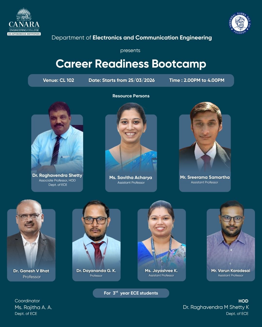 The Department of Electronics and Communication Engineering organized a Student Development Program titled “Career Readiness Bootcamp”, which was conducted from 25/03/2026 to 09/04/2026 and comprised a total of 24 hours. The program covered a wide range of core subjects, including Analog Electronics, Network Analysis, Digital Electronics, and Verilog HDL. The program commenced on 25/03/2026, with a session on PN junction diode and its V-I characteristics delivered by Dr. Raghavendra M. Shetty K, where students gained insights into semiconductor fundamentals and diode behavior. On 26/03/2026, Mr. Sreerama Samartha conducted a session on clippers and clampers, along with the realization of basic logic gates using diodes, helping students understand waveform shaping and logic implementation. The session on 27/03/2026, handled by Ms. Jayashree K, covered Kirchhoff’s laws (KCL & KVL), Thevenin’s and Norton’s theorems, and the Maximum Power Transfer theorem, enabling students to analyze and simplify electrical networks effectively. On 28/03/2026 (morning session), Dr. Raghavendra M. Shetty K explained transient response in RC and RL circuits, focusing on time-domain analysis. This was followed by another session on the same day by Dr. Ganesh V. Bhat, who discussed Operational Amplifiers and their applications, including integrators, differentiators, summers, and difference amplifiers. The session on 01/04/2026 by Mr. Sreerama Samartha covered BJT and MOSFET construction, working principles, characteristics, and biasing techniques, providing a strong foundation in analog electronics. On 02/04/2026, Ms. Savitha Acharya introduced Digital Electronics – Combinational Circuits, focusing on logic design and implementation. The session on 08/04/2026 by Dr. Dayananda G. K dealt with Sequential Circuits, helping students understand memory elements and state-based design. The program concluded on 09/04/2026 with an extended session on Verilog HDL conducted by Mr. Varun Karadesai, where students were introduced to hardware description language and its applications in digital design. This SDP was coordinated by Ms. Rajitha A A, Assistant Professor, Dept. of ECE |