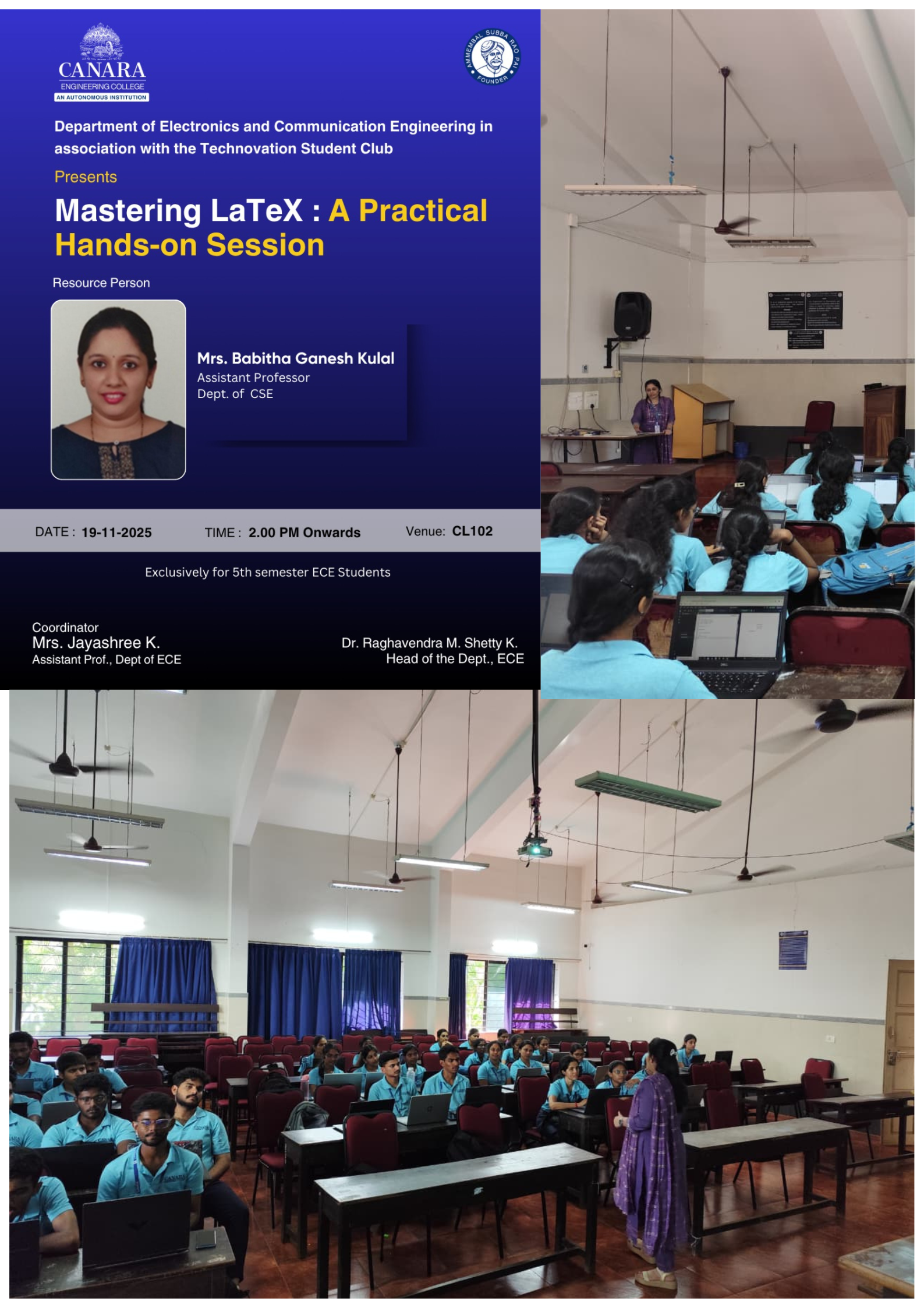 The Department of Electronics and Communication Engineering, in association with the Technovation Student Club, organized a hands-on session titled “Mastering LaTeX: A Practical Hands-on Session” on 19th November 2025 for the 5th semester ECE students. The session was conducted by Ms. Babitha Ganesh Kulal, Assistant Professor, Department of Computer Science and Engineering, and was coordinated by Mrs. Jayashree K, Assistant Professor, Department of Electronics and Communication Engineering. The session was held from 2:00 PM to 4:30 PM and focused on introducing LaTeX and its practical applications in technical documentation and academic writing. The resource person demonstrated essential LaTeX commands and guided the students through hands-on exercises, providing practical exposure to document preparation using LaTeX. A total of 35 students actively participated in the session, making it an informative and beneficial learning experience. |
