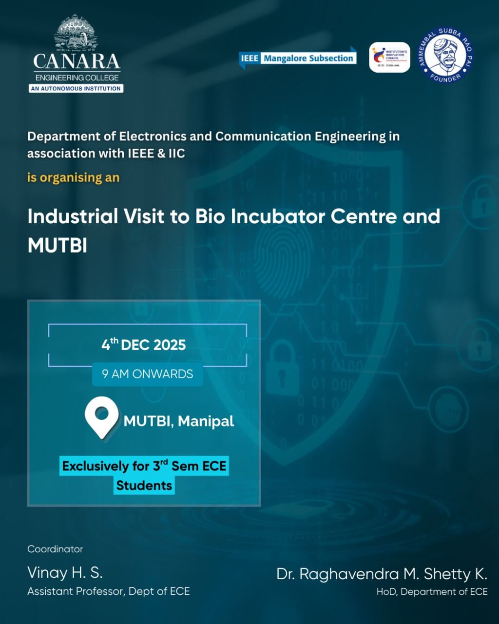 An industrial visit to the Bio Incubator Centre and Manipal University Technology Business Incubator (MUTBI), Manipal, was organized to expose students to innovation and startup incubation ecosystems. Faculty members from the Department of ECE accompanied the students to the facility. Experts explained the role of bio incubators in supporting biotechnology, healthcare, and technology-based startups. The infrastructure, shared laboratories, prototyping facilities, and regulatory support available to incubatees were discussed. The MUTBI team outlined the startup lifecycle, mentorship programs, funding opportunities, and IP management processes. Students interacted with incubated startups and gained insights into product development and commercialization challenges. The visit concluded with a briefing on government-supported innovation initiatives and opportunities for internships and research collaboration.The event is coordinated by Vinay H S |