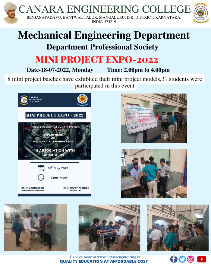 14 project batches have exhibited their academic project models in EXPO-2022 organized by our department in association with ACME and IIPC. Nearly 75 students of high school and PU colleges visited along with their staff in and around Benjanapadavu and also the students of 1st, 2nd and pre-final year students visited the Expo, seen the different kind of projects and understood new engineering concepts. Details of Prize Winners: 1st Place: Batch No: 2 Title of the Project: Development of Areca Leaf Cup Batch Members: 4CB18ME027-Rajesh Lobo 4CB18ME040-Sukesh 4CB18ME045-Vinyas Rao 4CB18ME048-Yashodhara Project Guide: Mr. Narayana Swamy, Assistant Professor. 2nd Place: Batch No: 1 Title of the Project: Design and Development of Meduvada Making Machine Batch Members: 4CB18ME010-Harshith 4CB18ME017-Lokesh 4CB18ME042-Umesh 4CB18ME044-Vinith Raj Project Guide: Mr. Naveen A Kalal, Assistant Professor. |