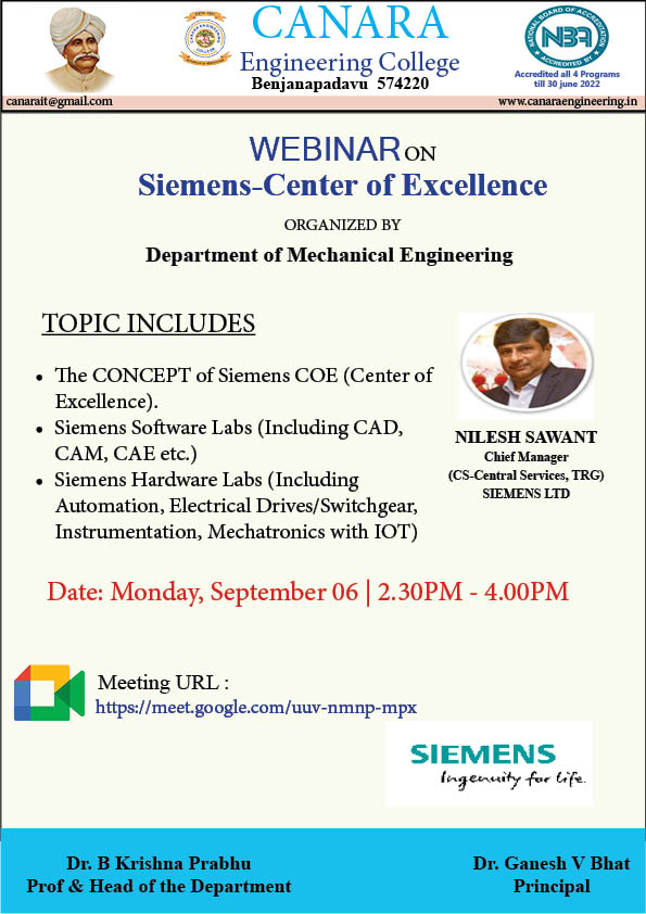 Webinar Series on an Initiatve to adapt Industry 4.0 in academics organised by Department of Mechanical Engineering. Under Chapter-1 of webinar series "An introduction to Industrial Internet of Things (IIOT)" by Mr. Somasundaram N Managing Director, Finixel Technologies Pvt Ltd, Bengaluru on 19.9.2020. Formal Function is inugurated by Mr. Vinayak kamath, CEO Auto CNC, Bengaluru and presided by Mr. M Padmanabh Pai,Correspondant, CEC . All Students and Faculties have participated in the webinar. |