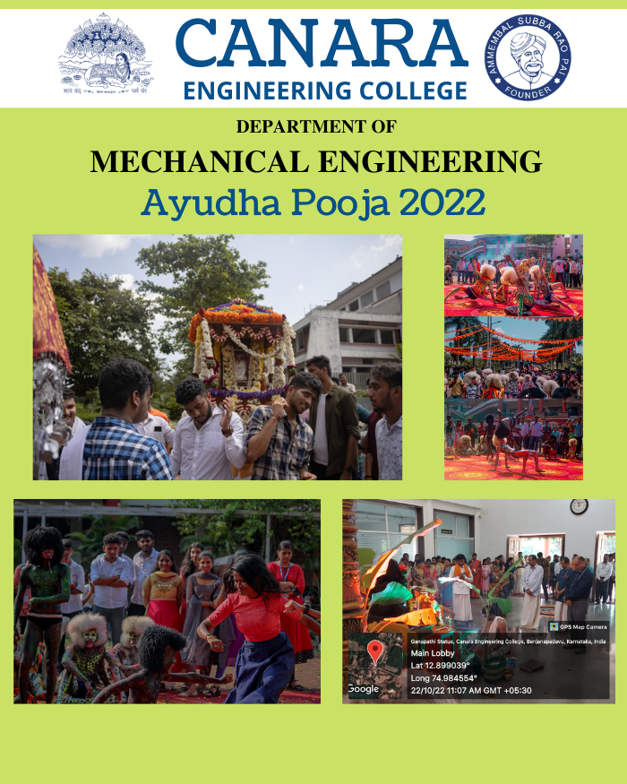 Aydha pooja was organized on 13th October 2021. The celebration of Ayudha Pooja is pride of Department of Mechanical Engineering. The procession of goddesses Sri Kateel Durgaparameshwari started at 10.30am from the college entrance with Chende, Nashik band,Pili Gobbu, Mahishamardhini Dance. The Pooja started at 1.00 in the machine shop and prasda distributed to the gathering. |